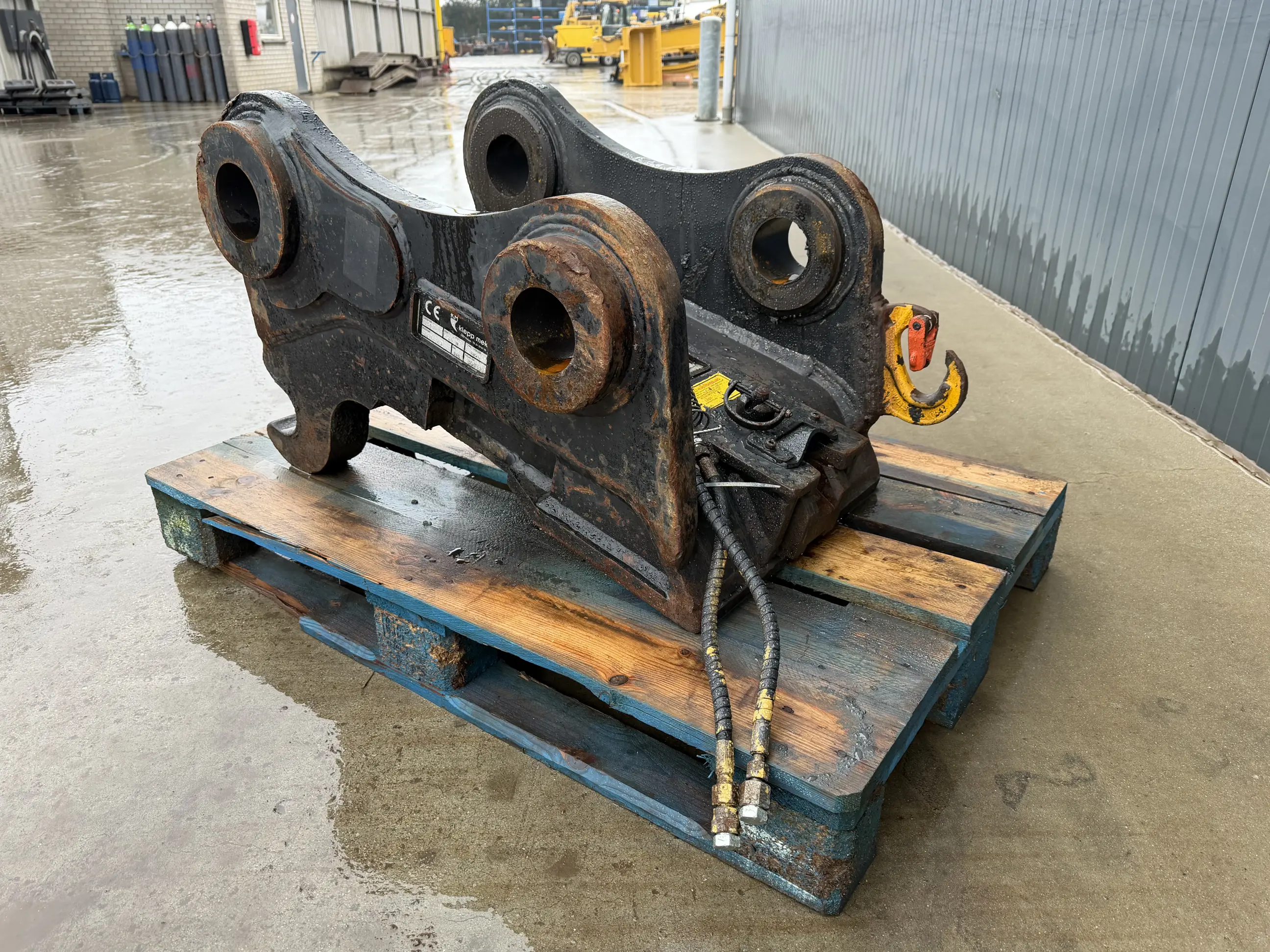 Used Klepp Mek quick coupler with S2 connection. The pins sizes are 100 / 90 mm – the stick width is 386 mm and the center to center distance is 488 mm. The linkage is DB.