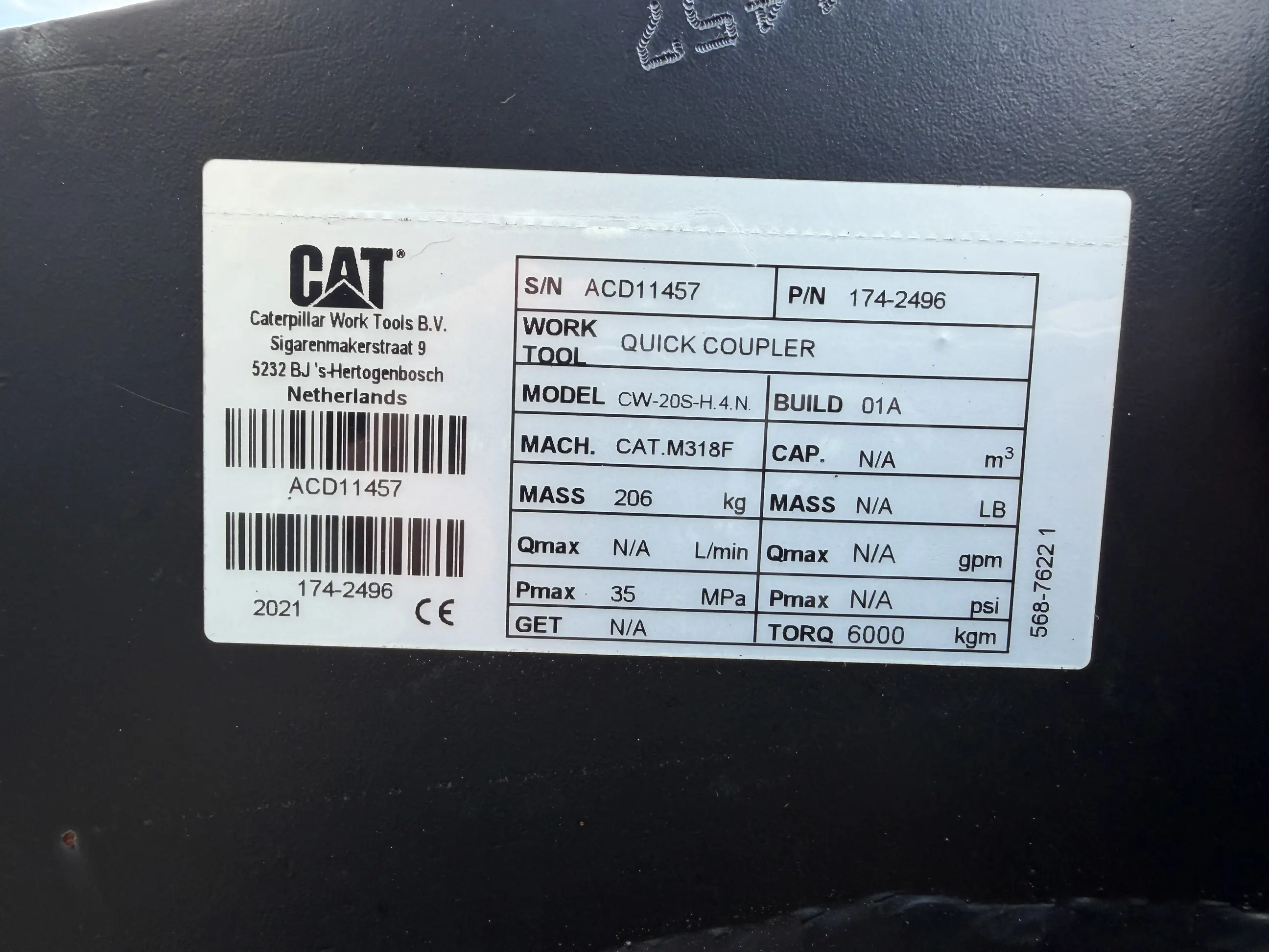 Unused hydraulic Verachtert quick coupler CW20S connection. Pin: 70 – Stick: 280 – center to center 430 mm.